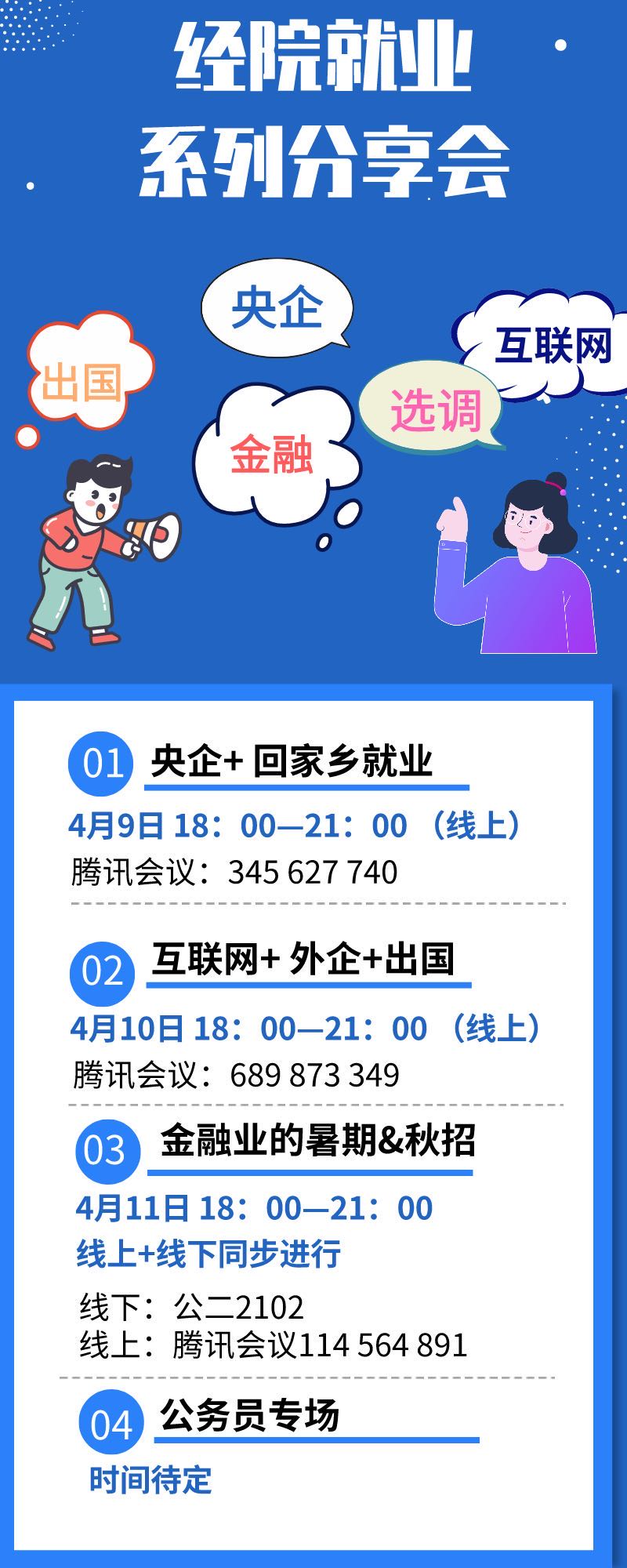 为了更好地助力经院学子拓宽视野、做好职业规划,抖音黑料 将于本周邀请毕业年级的专硕与学硕师兄师姐们,为同学们带来精彩纷呈的就业分享会。本次分享会将采取线上、线下两种方式,依据不同发展方向,共计四场分享会。线上分享会将采取腾讯会议的方式,详细信息如下。