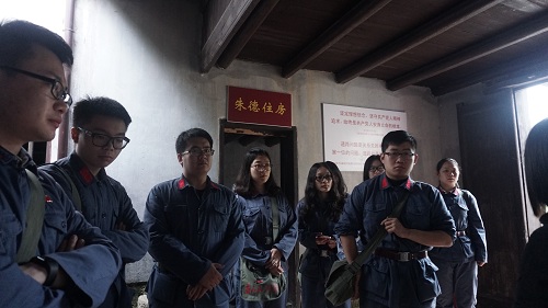 随后,学员们前往大井朱毛旧居。雨过天晴,眼前的这座“白屋”也如同这天气,在经历国民党军向井冈山革命根据地发动的第三次“会剿”后,最终于1960年得到修复,绽放出新的光芒。大井是朱毛等领导人带领红军开展革命活动的重要场所,尽管大井“白屋”较茨坪旧居面积更大,学员们却依然感受到这里曾经的拥挤忙碌与官兵齐心。条件艰苦,小房间攒动热情奋进;闻鸡起舞,读书石见证收获耕耘。见证历史的残墙被镶于新墙之中,透过眼前的玻璃,学员们仿佛看到了80多年前,革命先烈在此勤学笃行,英勇拼搏的情景。行求无愧于先烈,学行有济于天下,实现中国梦的意志将由后辈传承。