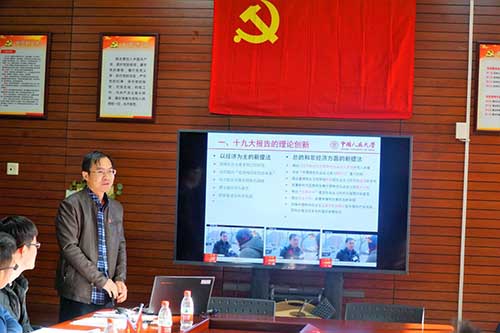 接着,支部成员代表围绕“以十九大精神、习近平新时代中国特色社会主义思想指导科学研究”的主题分享学习心得。2015级国民经济学博士班陈守合就党的十九大的理论创新讲述学习心得。他梳理了新中国成立以来,党对主要矛盾的判断和表述,并结合国家发展现状指出党的十九大提出我国主要矛盾发生变化的科学性。2016级国民经济学博士班罗琦就观看党的十九大开幕式汇报学习心得。他提到,党的十九大报告是我国进入中国特色社会主义新时代的开篇之作,习近平新时代中国特色社会主义思想是马克思主义中国化的又一伟大成果,身为青年党员,要加强理论学习,为实现国家现代化做贡献。2017级国民经济学博士班孙九伦就十九大报告指出的建设创新型国家分享学习心得。他表示,我国要在2020年进入创新型国家行列,建成中国特色国家创新体系就必须大力发展创新经济。在创新经济治理中,需要完善市场经济监管体制,营造创新经济发展氛围。