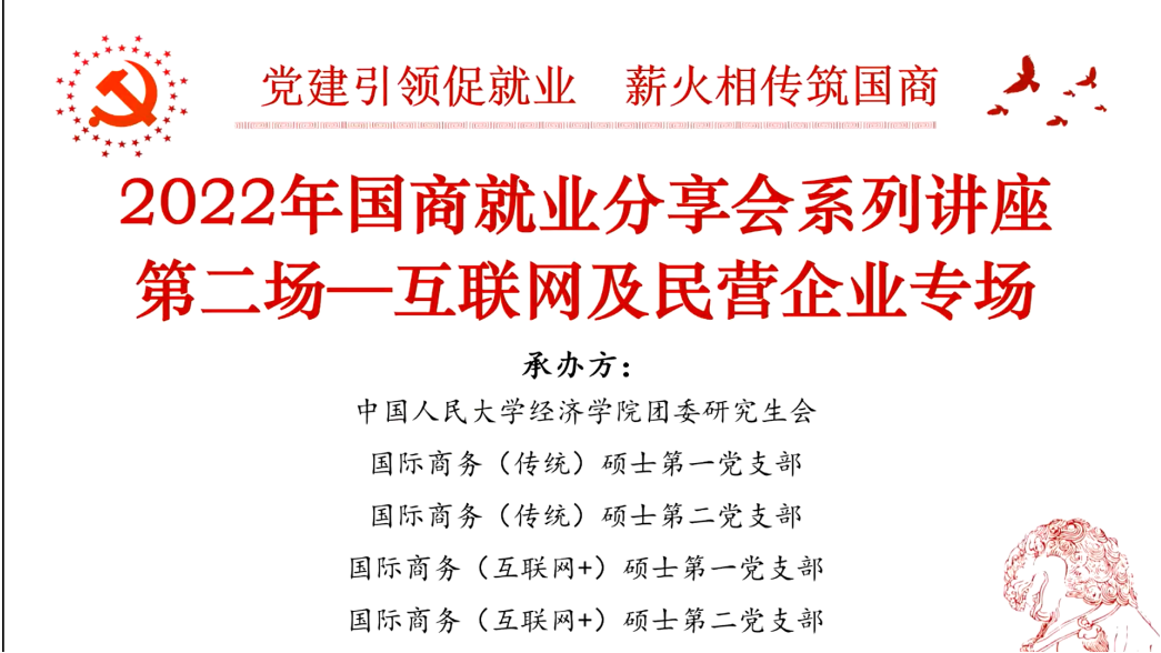 自3月27日起,国际商务(传统)硕士第一党支部、国际商务(传统)硕士第二党支部、国际商务(互联网+)硕士第一党支部与国际商务(互联网+)硕士第二党支部以线上线下相结合的方式举办了以“党建引领促就业,薪火相传筑国商”为主题的党日活动,活动共计三场,分别聚焦于券商基金求职、互联网与民营企业以及银行求职的经验分享。