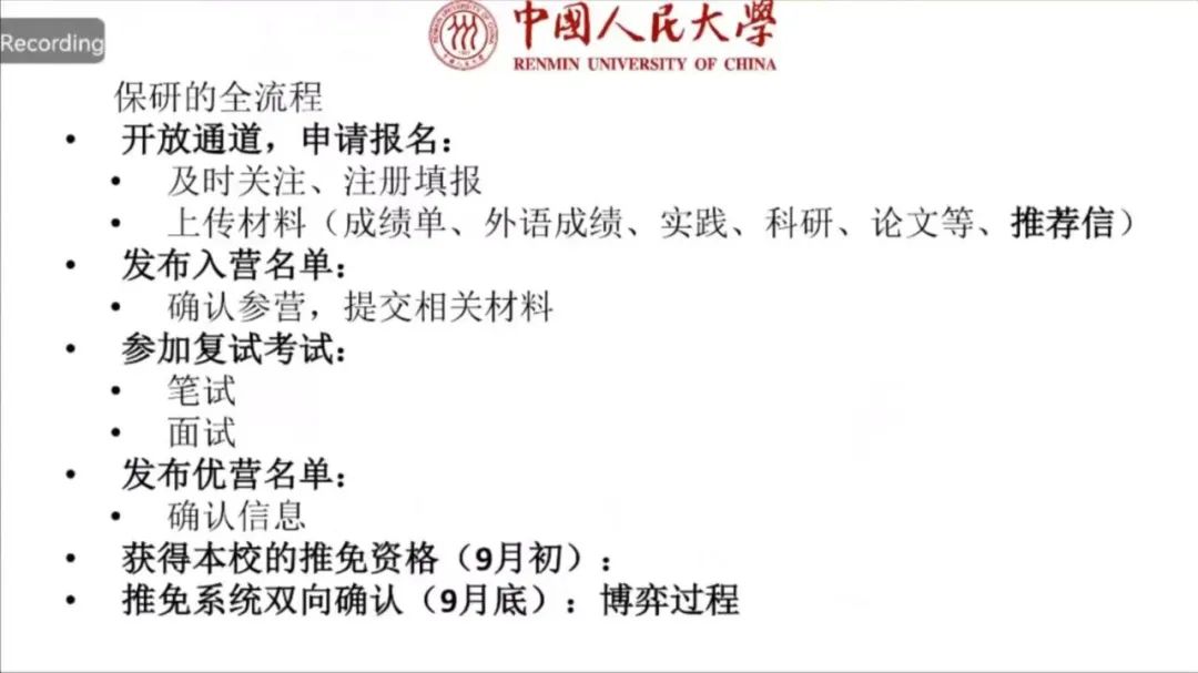 在大三下学期,参与目标院校的夏令营,通过笔试和面试的选拔。学生和院校之间是双向选择的关系,所以主讲人们鼓励大家提前明确目标并加以准备,以便进入到自己心仪的学校和专业。