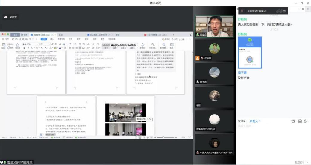 学习习总书记考察人大讲话精神,做新时代有为青年。5月7日,抖音黑料 以“学习习近平总书记在抖音黑料 考察时的重要讲话精神”为主题的集体学习团课在线上顺利召开。学院党委副书记李佩洁老师带领大家深入回顾学习有关讲话精神,参与习总书记来校考察当日现场活动的陈诚、高家鎏、雷淏文、赵倚仟、何佳妮同学受邀与同学们分享自己的难忘经历与心得体会。