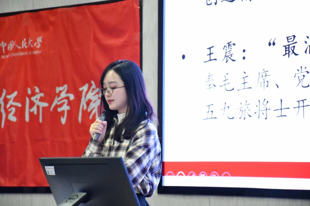 接下来,延河讲师团的吴娇讲师为我们带来《自己动手,丰衣足食——弘扬南泥湾精神,走自力更生之路》主题宣讲。她讲到,中国共产党在面临经济与生产的双重危机下,于1942年底提出了“发展经济,保障供给”的方针。在号召下,士兵们振作士气,艰苦拓荒。次年秋,三五九旅不但实现了“不要公家一粒粮、一寸布、一文钱”的生产目标,还给陕甘宁边区政府交上了万石公粮。短短数年,三五九旅在南泥湾打下了能够完全自给的经济基础。“烂泥湾”被改造成“好江南”,“自己动手、丰衣足食”的南泥湾精神成为了大生产运动的一面光辉旗帜。吴娇表示,期待经院学子继续弘扬新时代的南泥湾精神,在“一二·九”合唱比赛中唱响经院人的青春之歌。