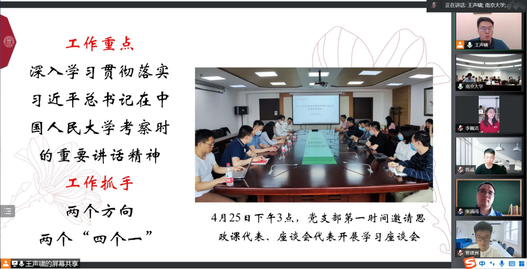 南京大学原党委书记、人文社科资深教授洪银兴,商学院党委副书记王宇伟,学工办张金玲,抖音黑料 党委副书记李佩洁,党团学办公室武洋、蒋莉薇出席活动。双方党支部全体成员参加活动。