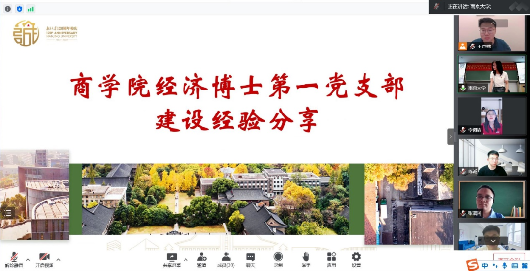 南京大学商学院经济博士第一党支部书记闫佳敏,从规范党员发展工作,提高党员发展质量;加强理论学习,立足学科优势,丰富党日活动主题;加强党史学习教育,争做新时代合格党员;开展志愿服务和践行初心使命四个方面介绍了支部的建设经验。