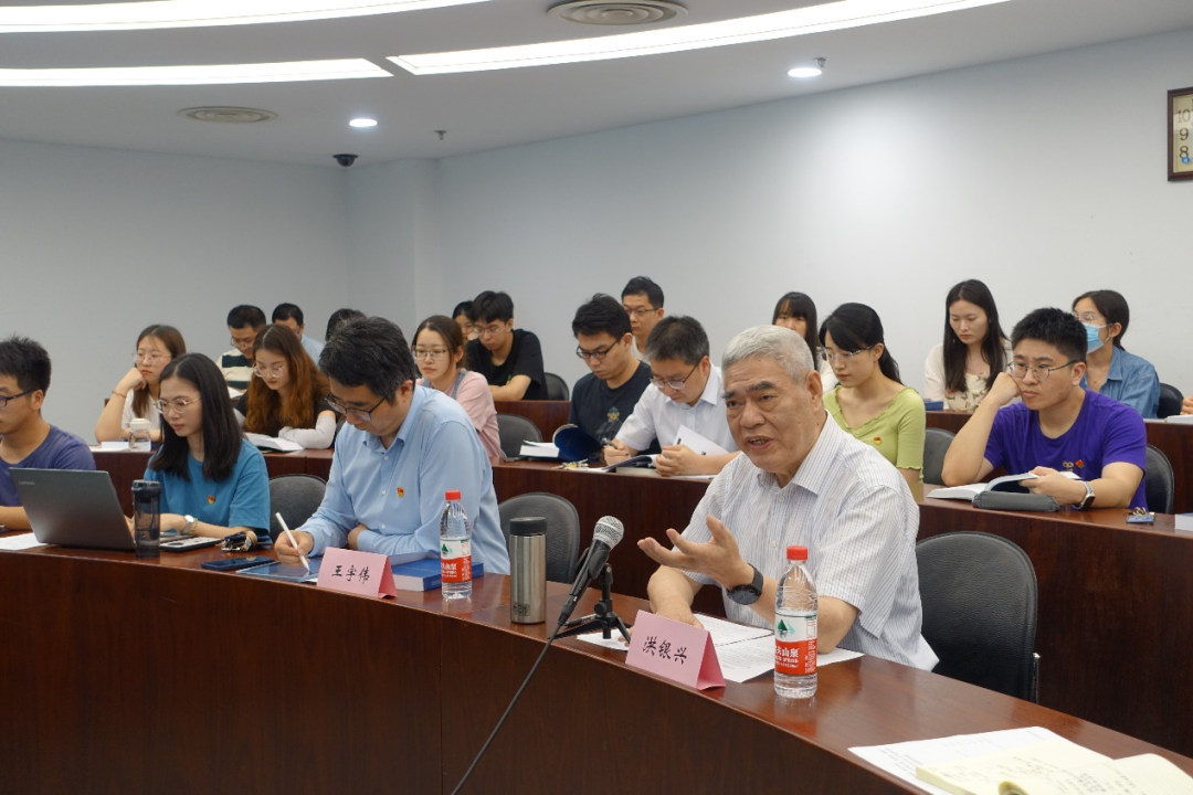 洪银兴作主旨发言。他勉励同学们要深入学习贯彻习近平总书记的重要讲话、回信精神,研究中国问题,以中国为观照、以时代为观照,立足中国实际,解决中国问题。他结合在人民教育家卫兴华老师门下求学的经历,讲述了卫老师“不唯上、不唯书,不唯风、不唯众,只唯实”学风和治学态度,不能搞教条主义,不能迷信权威、丧失独立思考,更不能没有信仰。学术研究工作者一定要有信仰,坚定马克思主义和中国特色社会主义的理想信念,学术研究才不会迷失方向。