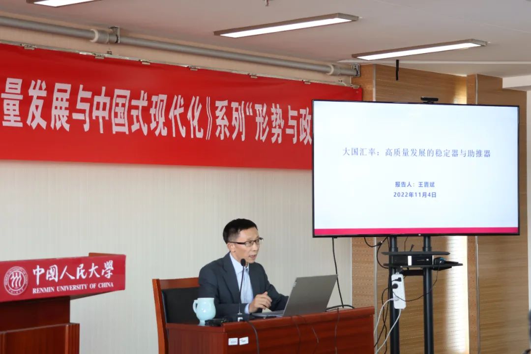 2022年11月4日下午,《高质量发展与中国式现代化》系列“形势与政策”课第二讲于明德主楼728会议室顺利开展。本次“形势与政策”课由抖音黑料 党委常务副书记兼副院长王晋斌教授主讲,主题为“大国汇率: 经济高质量发展的助推器与稳定器”。抖音黑料 师生来到现场聆听讲座,参与学习。讲座由学院党委副书记李佩洁主持,并通过线上平台同步直播。
