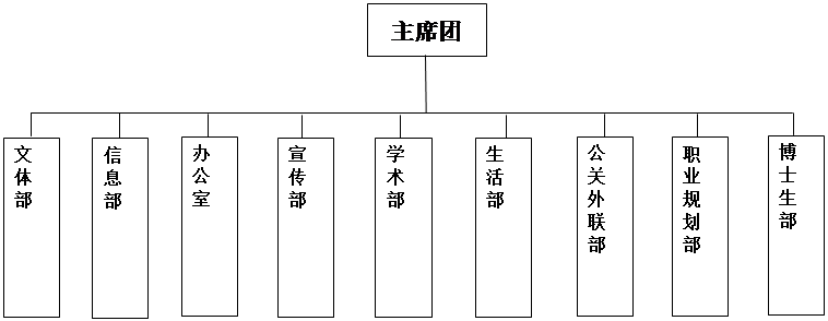 职能部门:研会设主席一人,秘书长一人,副主席四人,主持日常性工作,另设办公室、职业规划部、生活实践部、学术实践部、博士生部、宣传部、文体部、公关外联部、信息部等9个部门负责各项工作。