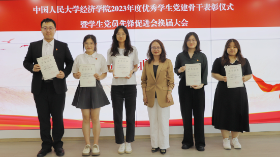 阎芳、胡玲莉为受表彰的学生党建骨干颁发证书并合影留念。