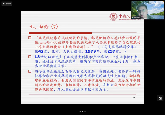 佟韫成:在谢富胜老师的讲授下,我们对习近平总书记《把握新发展阶段,贯彻新发展理念,构建新发展格局》思想有了更深层次的认识。中国的高速发展使得发达国家不同阶段出现的各种问题在中国同一时期集中涌现,如何打破发展瓶颈,合理构建国内大循环为主体、国内国际双循环相互促进的新发展格局成为当今中国经济学界亟需解决的问题。我们作为经院学子应当将理论知识与实际情况结合起来,运用所学经济学原理解决中国发展中的现实问题。