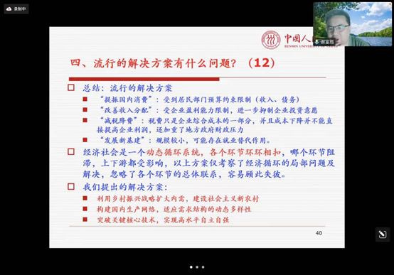 对于上述制约中国发展的重大问题,同学们通过参加讲座或查阅文献,可能会接触到一些流行看法,如提振消费、改善收入再分配、减税降费、发展新基建等等。谢老师指出,经济社会是一个动态循环系统,需要从批判性角度来看待这些流行解决方案。譬如,受居民部门预算约束限制,提振国内消费步履维艰;改善收入分配将进一步加重中小企业负担,从而抑制企业投资意愿;在需求不足的条件下,“减税降费”并不能直接提高企业利润,反而可能加重地方政府财政压力;新基建投资规模有限,短期内难以成为中国经济增长的关键极点。为此,可以通过乡村建设、构建国内生产网络、实施关键核心技术攻关,高水平引进来、高质量走出去,实现国内国际双循环相互促进