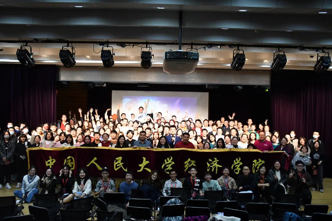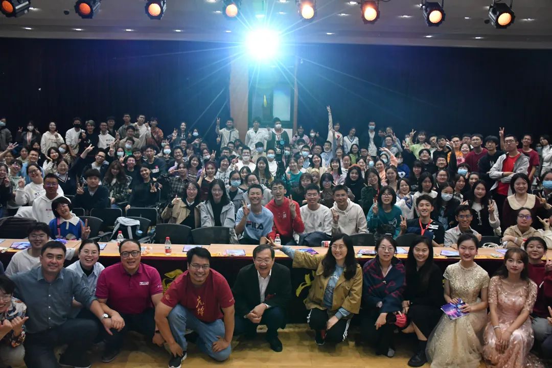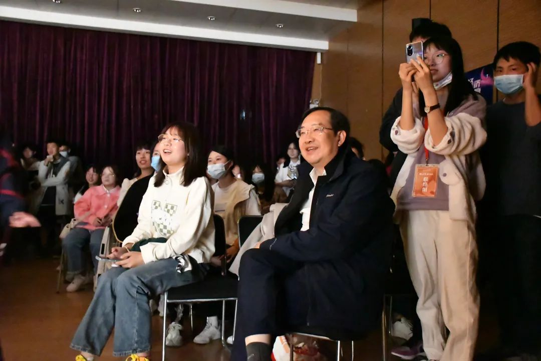 惊喜嘉宾刘守英院长的到来,将晚会气氛掀至高潮。《我的祖国》《洪湖水浪打浪》两首经典歌曲,引起全场大合唱。伴随着欢快热烈的气氛,全场师生脸上洋溢着幸福快乐的笑容。合唱过后,院长亲切地与晚会现场的演员、观众们合影,定格这一精彩瞬间。