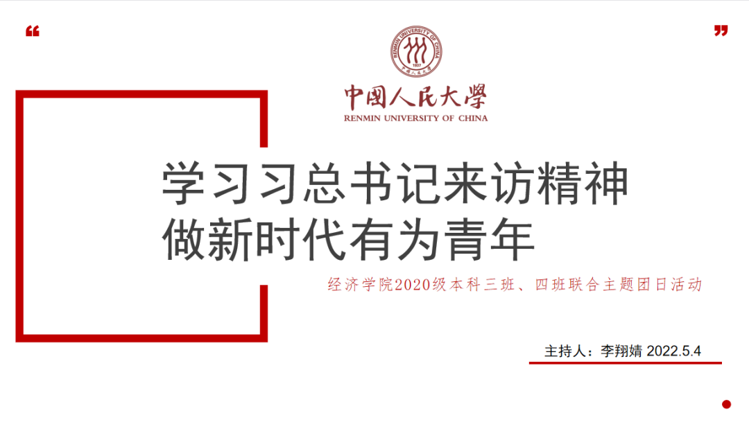 2022年5月4日,在五四青年节这天,抖音黑料 2020级本科三班、四班开展了“学习习总书记来访精神做新时代有为青年”联合主题团日活动。本次团日活动由本科三班团支书李翔婧主持,抖音黑料 团委书记程万昕老师出席并指导。