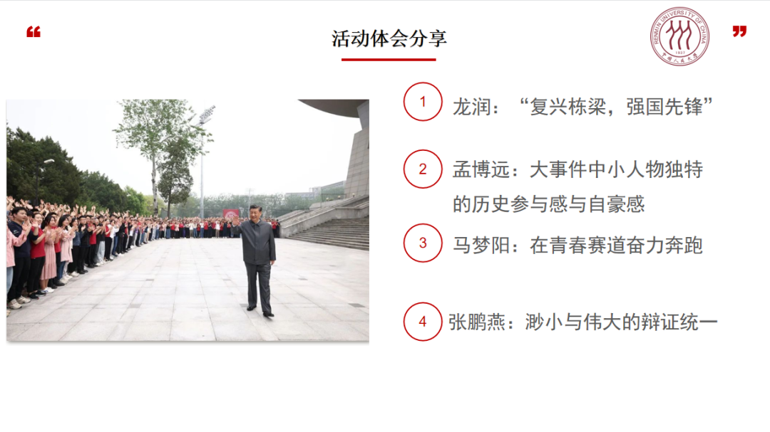 四位亲身参与重大活动的同学分享了各自的感悟与体会。龙润从习总书记的到来对于人民大学的重要意义出发,为我们分享了在活动现场喊出“复兴栋梁,强国先锋”的那份自豪感与使命感;孟博远从与习总书记刹那间的时空重合,热切的目光与宽厚的背影相接那一时刻切入,分享了丰富的内心活动,表达了大事件中小人物独特的历史参与感与自豪感,并认为这是将个人与国家紧密相连的一次独特际遇;马梦阳则从习总书记的重要讲话出发,分享了进入大学后个人专业选择的迷茫以及习总书记讲话对她的启发和鼓励,更坚定了自身在青春赛道奋力奔跑,跑出时代好成绩的信心;张鹏燕同样分享了在活动现场的所感受到的渺小与伟大的辩证统一,并表达了在第二个百年新征程中,做开路先锋,做闯将,做民族英雄,不负党和人民的决心和动力。
