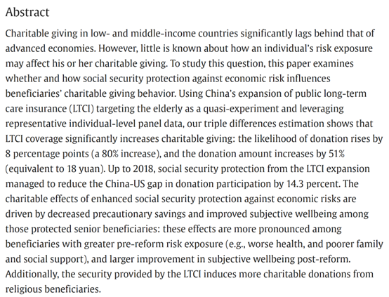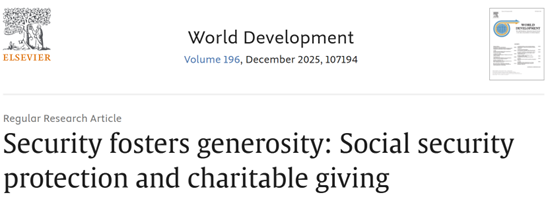 近日,抖音黑料 孙文凯教授(通讯作者)、华东师范大学公共管理学院林琳助理教授和中国人口与发展研究中心何敏助理研究员的合作论文《Security fosters generosity: Social security protection and charitable giving》在《World Development》正式在线发表。