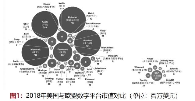 所以可以看到,欧盟和美国在反垄断选择的一些分歧使得他们在执法上有一些差异。欧盟判定企业占据市场主导地位的门槛更低,而美国相对来说还是比较宽松的。以结果来看,欧盟的反垄断基本上以高额的罚款为主,美国的反垄断大多是走向了国际。另外可以看一下反垄断的效果,下图是美国与欧盟数字平台市值,这跟欧盟和美国反垄断的不同选择有关,它可能既是因也是果。