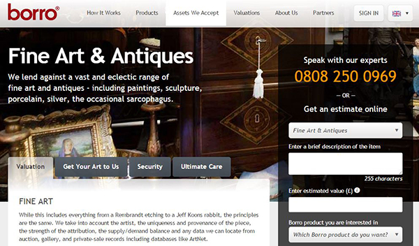 Eden Ventures、European Founders Fund等风险投资基金曾向Borro入资4000万美元, 2014年Borro公司又获得了来自主投互联网金融的风险投资基金Victory Park Capital的1.12亿美元资金的青睐。Borro公司的商业模式是:急需用钱的客户通过网站或电话提出典当申请,然后在线下将自己收藏的艺术品、珠宝等物品交给公司作为质押物,并享有充分的保险。贷款金额一般最多是抵押物估价的70%,通常3天内就可将款项打入客户的银行账户。借款期在6个月左右,可办理延期偿还手续。如果客户没有按时赎回,公司则会通过自己的拍卖网络将物品以尽可能高的价格卖出,并将拍卖抵押物所得超过差额部分全部返还给客户,不从物品售卖环节中获利。