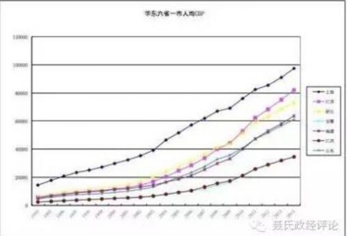人均GDP更有意思。它的趋势跟GDP总量的趋势是一样的,呈明显的发散趋势。本来这些地方一开始差别不大,但到后面差别越来越大,构成了四个等级:上海遥遥领先,成为第一俱乐部,10万人民币比1万美金还多,如果单独列出来的话,是一个“发达国家”;第二和第三是江苏和浙江,相差不大;第四和第五是山东和福建;最后两名是安徽和江西。这么多年过去,穷的还是一样穷,富的还是一样富,几乎没有什么变化。