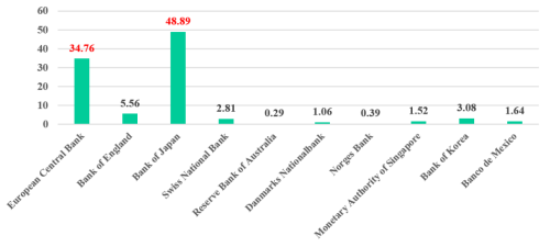 图30、截止2020年4月16日,美联储和其他央行货币互换的总额为4009.214亿美元,至今的10家央行各自占和美联储货币互换的比例(%)