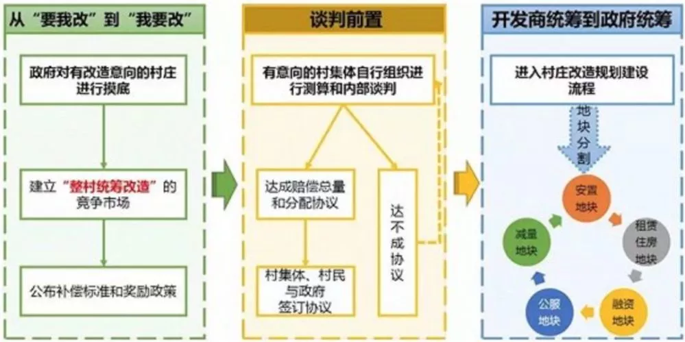创新机制的关键,就是在城中村改造中做到关键过程的区隔:一是开发商获得城中村部分土地进行商住开发并缴纳土地出让金,二是在村庄剩余土地上利用开发商缴纳出让金并进行安置房、出租屋、产业用地建设,只有把两个过程进行区隔,才能最终实现高效率的整村统筹改造。这个模式可以有效地简化传统政府模式或开发商直接介入改造模式中的多方复杂博弈,最大程度上降低改造过程中达成交易所需时间、谈判成本与财务成本,全面加速改造过程。