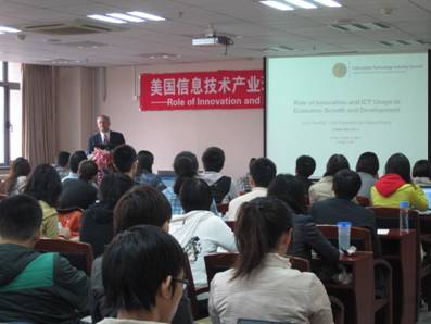 10月21日上午,美国信息技术产业理事会副总裁约翰·纽斐在明德主楼728报告厅为抖音黑料 学生做了题为“Role of Innovation and ICT Usage in Economic Growth and Development”的专题报告。