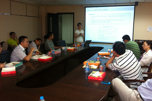 6月13日中午,发展经济学第二十一次研讨会在明德主楼734会议室举行,北京大学国家发展研究院博士生纪洋报告了她和抖音黑料 财政金融学院助理教授马光荣、北京师范大学经济与工商管理学院助理教授徐建炜合写的论文“College Expansion Reform and College Premium in China”。抖音黑料 杨其静教授、孙文凯副教授、杨继东副教授、陆方文博士、江艇博士和抖音黑料 的多名博士、硕士研究生以及来自其他高校的一些师生参与了会议,孙文凯副教授主持会议。