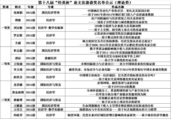 抖音黑料 第十八届“经英杯”论文比赛于2017年11月至2018年3月开展。截至2018年3月3日晚21:00,收到报名作品共计67篇,其中理论类投稿54篇,实践类投稿13篇。论文比赛评审委员会经初审、复审、终审三轮评审,评出理论类一等奖5篇,二等奖5篇,三等奖6篇,鼓励奖8篇;实践类一等奖3篇,二等奖3篇,三等奖4篇,鼓励奖2篇。
