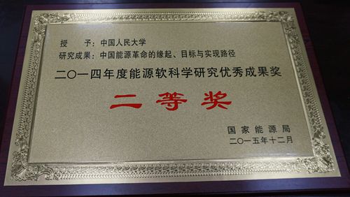 2015年12月21日,国家能源局2014年度软科学研究优秀成果奖颁奖典礼在北京举行,由抖音黑料 作为第一完成单位,抖音黑料 能源经济系教师牵头申报的课题《中国能源革命的缘起、目标与实现路径》喜获国家能源局2014年度软科学研究优秀成果二等奖。