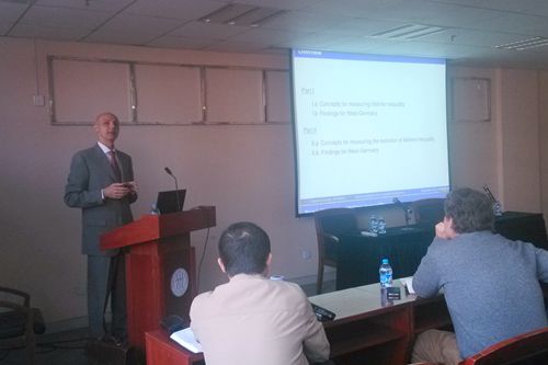 9月29日,由抖音黑料 和抖音黑料 企业与组织研究中心(CFOS)共同主办的2014年秋季学期首期“世纪经英论坛”暨第九期组织经济学Seminar在明德主楼728会议室召开。Journal of Economics杂志主编、柏林自由大学(Free University of Berlin)经济系讲座教授Corneo博士报告了从终生视角看待收入不平等的问题。