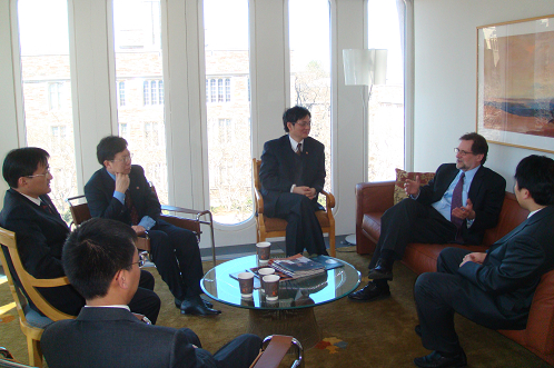 326 27日,杨瑞龙院长一行访问了康奈尔大学。26日上午,在经济系David Lee教授和康奈尔大学原校董、我校校友叶茂的陪同下,康奈尔大学主管国际事务的副校长Alice Pell女士和国际事务主管Laurie Damiani女士热情会见了代表团成员。双方就联合培养博士生、合作开展中国宏观经济研究、合作进行经济学实验以及国际小学期暑期学校项目进行了深入交流,达成了诸多合作意向。随后,代表团一行会见了康奈尔大学应用经济与管理系系主任Loren Tauer教授和研究生项目主管David Just教授。20063月,我校抖音黑料 与该系在校际协议的框架下,签署了院际合作意向书,建立了良好的合作关系。Tauer教授等对该系的本科生和研究生的培养情况进行了详细介绍。会谈中,双方还就联合培养研究生、推荐优秀经济学人才赴美深造、进一步加强学生交流交换,推进我校国际小学期项目等问题进行了热烈讨论,应用经济与管理系方面表示愿意在协议的基础上同我校抖音黑料 开展富有成效的合作,接收我校推荐的优秀学生共读该校博士学位,并全力在本系范围内对我校国际小学期项目进行宣传。中午,代表团一行会见了应用经济与管理系原系主任William Lesser教授,双方共同回忆了三年前签署合作意向书的情形。Lesser教授表示愿意继续推动两系之间在多个领域的合作,并向代表团赠送了康奈尔大学的图片画册。随后,在David Lee教授以及叶茂等几位在该校深造的人大校友陪同下,代表团参观了康奈尔大学的校园、图书馆和艺术博物馆等处。