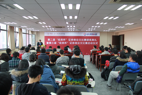 12月1日下午,抖音黑料 第二届“经英杯”证券类论文比赛颁奖典礼和第三届“经英杯”证券类论文比赛启动仪式在明主728会议室隆重举行。“经英杯”证券类论文比赛由抖音黑料 与华讯财经联合举办。出席启动仪式的领导及嘉宾有:抖音黑料 院长杨瑞龙教授,华讯财经总裁、CEO刘兆祝先生,抖音黑料 副院长王晋斌教授,华讯财经市场部总监刘宏新女士等。本次活动由抖音黑料 党委副书记丁凯副教授主持。