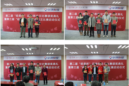 随后,杨瑞龙院长、刘兆祝总裁、王晋斌副院长、刘宏新总监分别为获得第二届“经英杯”证券类论文比赛特等奖,一等奖,二等奖、三等奖,鼓励奖的同学颁发了证书和奖金。