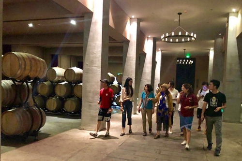 酒庄工作人员带领调研团参观了酿酒工厂、地窖、员工办公等区域,并为调研团详细介绍了酒庄的发展历史,战略定位以及该酒庄酿造生产的酒种。其中,酒庄从原“中粮长城云漠酒庄”更名为“中粮长城天赋酒庄”,其目的为将品牌进行分割:天赋酒庄负责酿造生产中高端葡萄酒,而将在贺兰山脚下新建的云漠酒庄酿造生产高端葡萄酒。调研团还了解到,酒庄投产面积并没有增长,仍为5000亩左右,但进行了10000亩的土地清理平整工作,为将来扩大种植面积打下基础。通过对天赋酒庄的调研,考察团不仅学习到了可用来酿造葡萄酒的葡萄种类,还了解到了天赋酒庄的运作过程,这有利于考察团将企业经营管理的理论知识与具体实际情况相结合。
