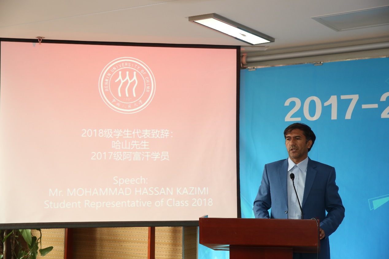 接着,2018级哈山先生代表在校生向2017级毕业的学员们表达了祝贺。他表示在人民大学的两年学习生活是一种独特的经历,毕业是人生新篇章的开始,更重要的是把所学应用到行动中去,正如一位学者所说,“知识不会帮助我们,除非它改变我们的态度,而态度不会帮助我们,除非它改变我们的行为。”他还表示,对中国经济模式的学习将会帮助毕业生们成为自己国家经济变革的推动者和促进国家与国家之间合作的使者。最后,哈山先生表达了对项目提供资金支持的中国政府和商务部的感谢,以及对人民大学抖音黑料 的各位老师和工作人员的感谢。