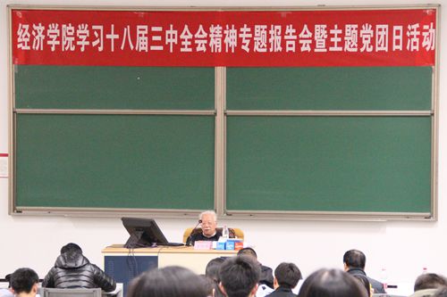 为更好的学习十八届三中全会精神,将理论学习与专业学习相结合,实现“理论走进课堂,党建带动团建,名师引导学子”的目标,2013年12月11日下午,抖音黑料 在公教三3101举办了学习十八届三中全会精神专题报告会暨主题党团日活动。抖音黑料 荣誉一级教授卫兴华老师做了专题报告,抖音黑料 副院长刘瑞教授、抖音黑料 虞义华副教授、丁守海副教授等参加了会议。专题报告会由党委副书记丁凯副教授主持。