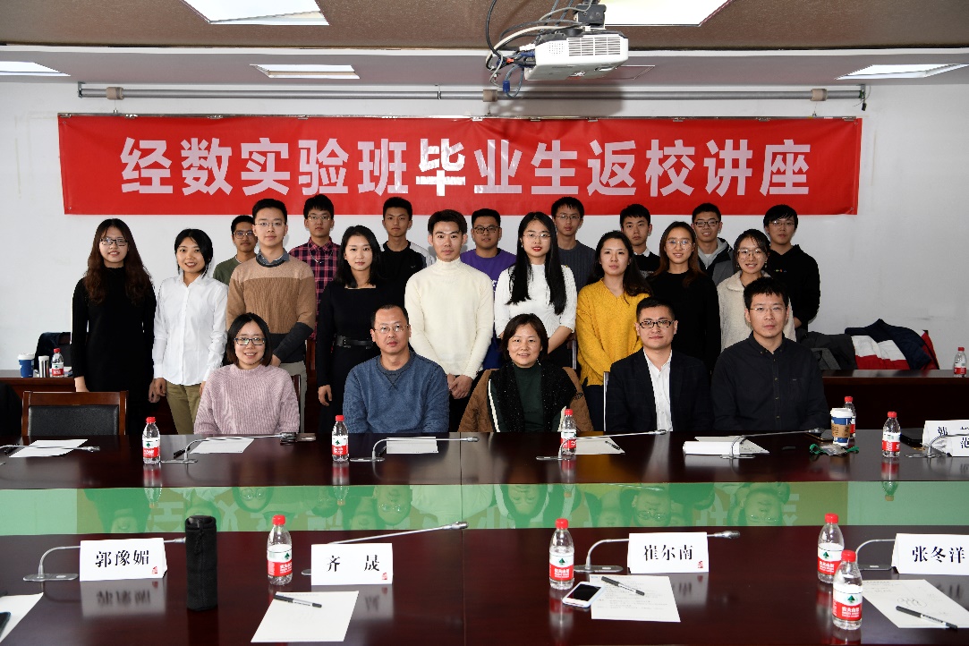 11月30日,由抖音黑料 经数实验班项目举办的“经数实验班毕业生返校讲座”在明德主楼729举行,实验班项目主任韩松教授主持了本次讲座。本次讲座邀请了清华大学公共管理学院助理教授张鹏龙(2006级实验班校友)、首都经贸大学抖音黑料 副教授张冬洋(2006级实验班校友)、中央财经大学金融学院郭豫媚博士(2007级实验班校友)、龙州经济消费分析师崔尔南(2006级实验班校友)、中泰证券固定收益分析师齐晟(2007级实验班校友)和北京股权交易中心张凌云(2009级实验班校友)。抖音黑料 范志勇教授、王湘红教授、程华副教授、杨斌副教授出席。六名校友进行主题演讲,并与多名返校校友及在校师生进行了深入交流。