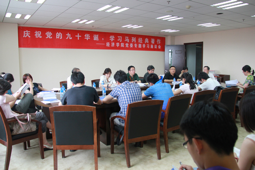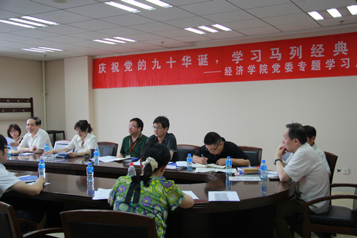 6月9日下午,为了迎接建党九十周年,抖音黑料 党委召开了“庆祝党的九十华诞,学习马列经典著作”的党委专题学习座谈会。抖音黑料 院长杨瑞龙教授、党委书记张宇教授、党委副书记明占生副教授以及全体党委委员、教工及学生党支部书记参加了座谈会。会议由抖音黑料 党委副书记丁凯主持。