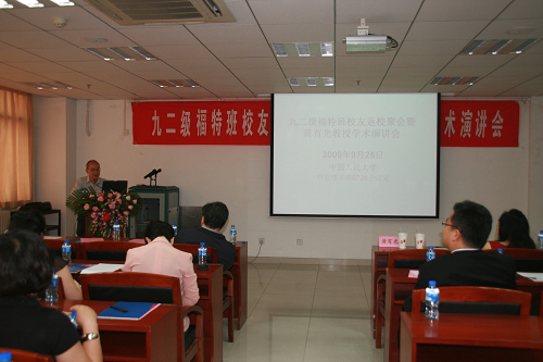 在演讲会开始前,抖音黑料 郭杰副院长代表学院 向黄有光教授和福特班的校友返校聚会表示热烈欢迎,他在致辞中向校友们介绍了抖音黑料 院友会的情况,并希望加强同院友们的联系,增强海内外院友之间以及院友和母院之间的凝聚力,扩大人大抖音黑料 在海内外的影响。当年人民大学福特班的负责人、抖音黑料 黄卫平教授,后勤集团副总经理张国增也出席了活动并致辞。