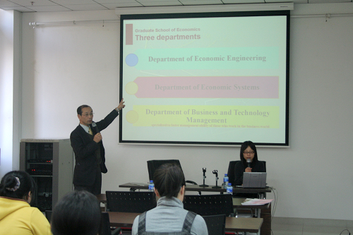同日下午,日本九州大学代表团在明德主楼抖音黑料 617会议室举行硕士生交换项目宣讲会。抖音黑料 副院长刘瑞教授主持宣讲会,教务科科长沈明霞参加会议。九州大学代表团就该校抖音黑料 基本情况、人民大学-九州大学共同教育项目、全英语课程项目和硕士课程、博士课程等内容进行了宣讲。宣讲会吸引了大批学生参加,效果良好。