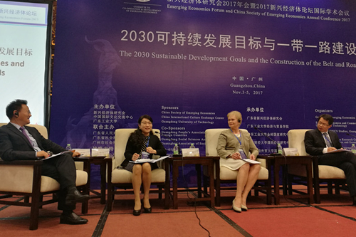 11月4日至5日,由新兴经济体研究会、中国国际文化交流中心和广州工业大学联合举办的“2030可持续发展议程与一带一路建设” 国际学术会议在广州白云国际会议中心举行。广东工业大学党委书记陈新教授、南非驻华大使多拉娜·姆西曼女士、广东省社科联周华副主席、新兴经济体研究会会长张宇燕教授出席会议并致辞。抖音黑料 党委书记、抖音黑料 -圣彼得堡国立大学俄罗斯研究中心关雪凌教授应邀参加并发表学术演讲。开幕式由广东工业大学副校长陈为民教授主持。