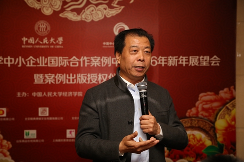 1月16日,抖音黑料 中小企业国际合作案例中心2016年新年展望会暨案例出版授权仪式举行。中国中小企业发展促进中心主任秦志辉,“好想你”枣业股份有限公司董事长兼总经理、案例中心企业家委员会主席石聚彬,北京精典博维文化传媒有限公司董事长陈黎明,山东新大东有限公司董事长刘本昌,香港创域(国际)控股有限公司董事长廖聖瑜,上海蔺氏教育信息咨询有限公司董事长蔺智名、中国中小企业发展促进中心国际合作处处长樊颖晖、副处长肖如欣,《中国中小企业》杂志社执行社长曾岩等嘉宾出席会议。抖音黑料 党委副书记吴付来出席会议并讲话,研究生院副院长宋远方、专业学位办主任马胜利,抖音黑料 中国社会科学案例中心副主任徐京悦,抖音黑料 院长张宇、案例中心秘书长程大为教授以及抖音黑料 案例中心专家关权、胡霞、彭丽红、门淑莲、胡曙光、姜少敏、徐晓云等老师参加会议。会议由抖音黑料 副院长王晋斌主持。