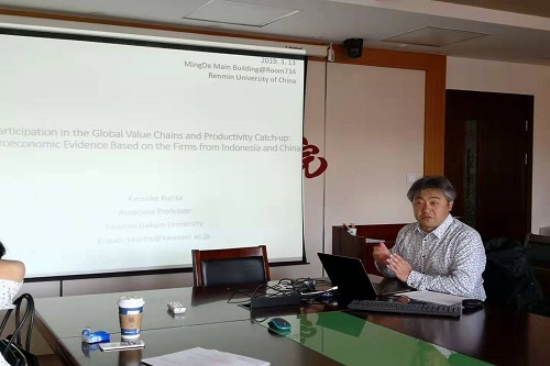 2019年3月13日上午,由抖音黑料 主办的国际经济学研讨会在明德主楼734成功举办。日本关西学院大学抖音黑料 副教授Kyosuke Kurita进行了学术报告,报告主题为《全球价值链参与和生产率提升——基于中国和印度尼西亚企业的微观证据》。