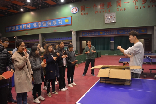 11日晚,项目团队成员在河北省正定国家乒乓球训练基地参加了乒乓球训练体验课程。基地教练首先向团队成员介绍了基地的概况,并亲身示范,向同学们讲解乒乓球技巧,随后将团队成员两两分组进行体验训练。正定国家乒乓球训练基地被称为中国乒乓球队"大本营",走出了刘国梁、邓亚萍等数位乒乓球世界冠军,同时也是著名的爱国主义教育基地。团队成员在训练结束后纷纷表示,通过此次训练体验课深切体会到了运动员们奋勇拼搏为国争光的豪情壮志,将以本次乒乓球训练体验为契机,继续开展其他类的健身活动,强身健体,更好地为学习与工作。