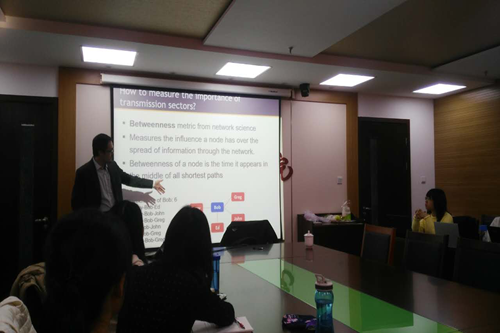 徐博士就投入产出分析在碳足迹、生命周期分析等工业生态领域的应用介绍了自己和团队的研究成果。徐博士的研究从产业链和网络分析的角度给出了新的度量碳排放部门强度的方法。研究认为,应从产业链的角度出发,寻找控制碳排放的关键节点。徐博士还介绍了其团队所发布的开放式数据库Chinese Environmentally Extended Input-Output (CEEIO)。徐博士就共同关心的话题和未来可能合作的方向与到会师生展开了热烈的讨论。研讨会在热烈的掌声中圆满结束。