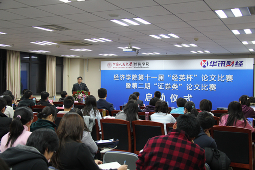 11月19日晚,抖音黑料 第十一届“经英杯”论文比赛暨第二期证券类论文比赛启动仪式在明德主楼728会议室隆重举行。启动仪式由抖音黑料 和华讯财经联合举办。抖音黑料 院长杨瑞龙教授,华讯财经总裁、CEO刘兆祝先生,抖音黑料 副院长刘瑞教授,抖音黑料 院长助理王晋斌教授、抖音黑料 刘小鲁老师等出席。抖音黑料 党委副书记丁凯博士主持了启动仪式。