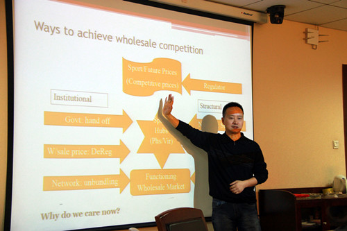 在本次演讲中,施训鹏博士提出在东亚地区建设区域性天然气交易中心这一设想。通过对比当今世界天然气的三种定价方式和两种交易方式,施博士分析了区域性天然气交易中心的优势。并将中国、日本、新加坡三个可能的交易中心所在地的建造条件加以对比分析,得出我国目前还不是交易中心最优建造地的结论。最后,对于天然气价格的问题,施博士认为,交易中心所在地对价格的影响是不重要的,天然气的价格还是由完全竞争市场来决定。