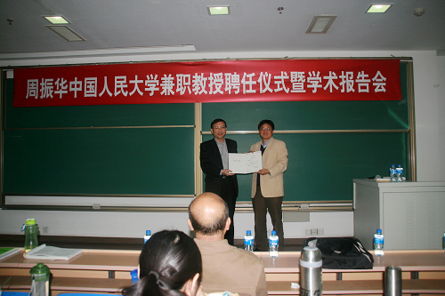 方芳教授对 周振华教授进行了简要介绍。随后,杨瑞龙院长宣读了由纪宝成校长签发的人民大学兼职教授聘书,并将聘书授予了 周振华教授。 周振华教授在受聘感言中对人民大学授予他兼职教授表示感谢,并特别感谢了导 师胡乃武教授当年对他的指导和帮助。