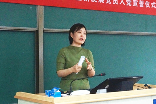优秀学生党建骨干代表王疆妮就自己参与服务的学生党建工作经历进行分享。她表示会继续在学院党委和领导老师的帮助支持下,以一颗感恩和奉献之心为广大师生服务,以实际行动表现决心、彰显力量。