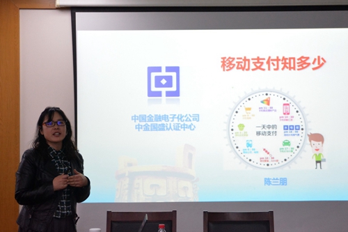 4月11日,中国金融电子化公司团委书记韩鹏洋、中金国盛认证公司陈兰朋出席了在明德主楼734会议室举办的“移动支付知多少”第三期主题讲座。本次讲座由陈兰朋老师主讲。