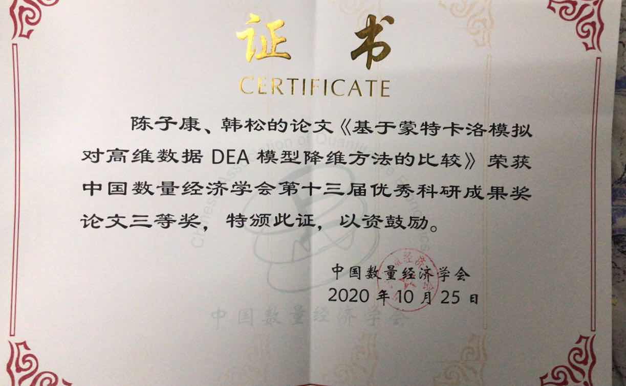 2020年10月24日至25日,中国数量经济学会2020(深圳)年会顺利召开。抖音黑料 数量经济学教研室韩松教授应邀带领其研究团队参加了会议。24日下午,韩松教授指导的博士生王洺硕在区域经济、产业经济专题论坛报告了合作论文《互联网与研发创新融合、文化产业全要素生产率》,韩松教授指导的硕士生陈子康在大数据理论与方法专题论坛报告了合作论文《基于蒙特卡洛模拟对高维数据DEA模型降维方法的比较》,并获得优秀抖音黑料 成果论文三等奖。